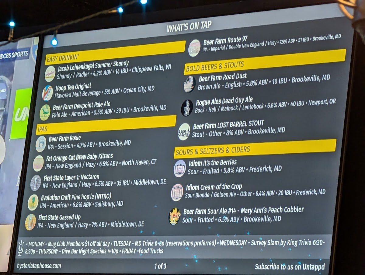 While the menu leans toward minimal snacks, nearby eateries like Wingman provide delicious carryout options, enhancing your experience. The attentive and knowledgeable staff are a highlight, eager to share insights on their rotating taps, ensuring every visit is unique. As described by patrons, Hysteria feels like the neighborhood gathering spot akin to "Cheers," where great service meets community vibes.